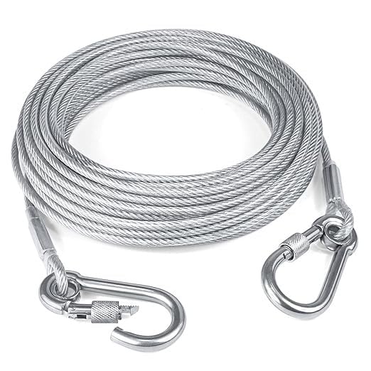 Featuring dual metal hooks with secure locking mechanisms, it provides a strong and reliable connection to trees, poles, or anchor points, giving your dog the freedom to move while staying safely restrained. Ideal for training, outdoor play, camping, or backyard use, this cable leash ensures peace of mind for pet owners.
