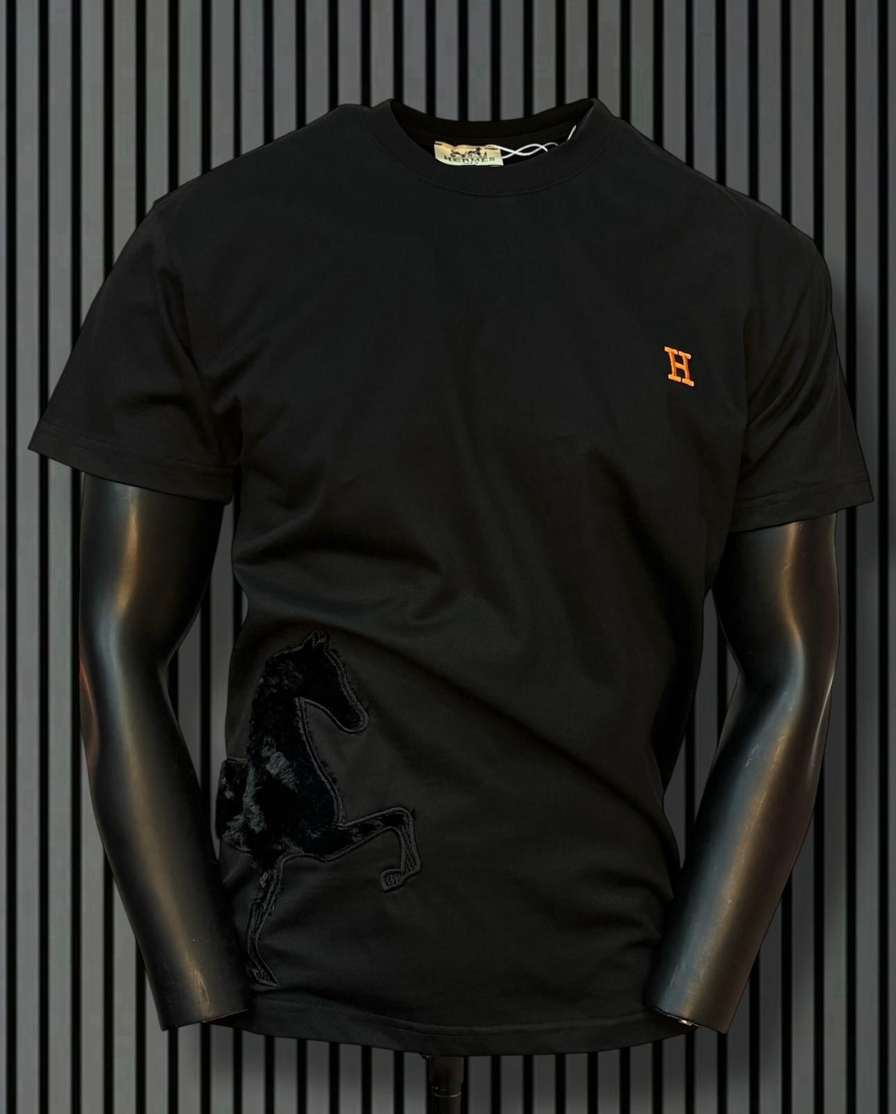 Make a bold style statement with this Premium Black Graphic T-Shirt for Men, designed for those who appreciate minimal fashion with a touch of luxury. Featuring a sleek black base, a subtle “H” chest logo, and a stylish embossed horse design, this t-shirt adds a unique and modern edge to your everyday look.