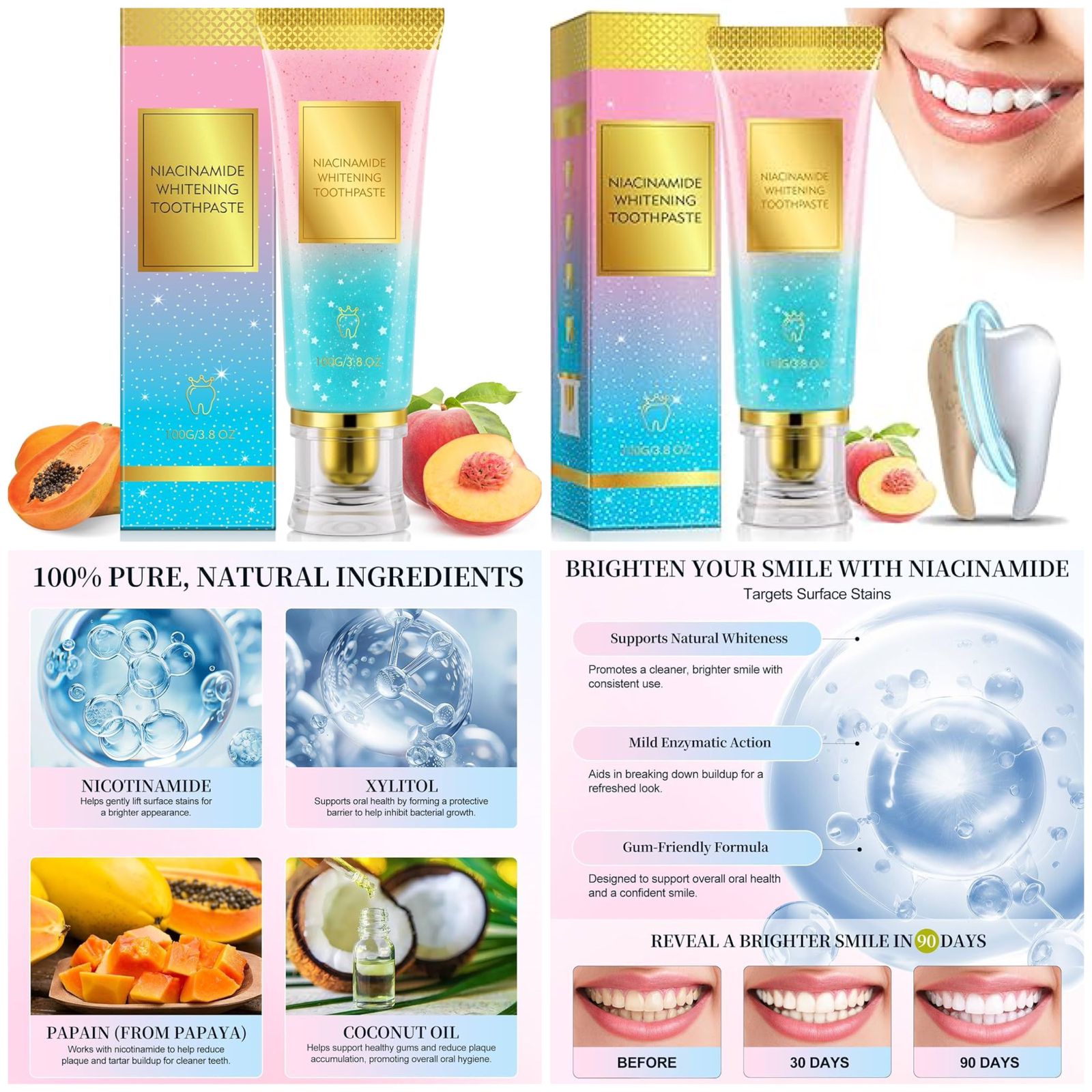 Formulated with Niacinamide (Vitamin B3), this toothpaste helps remove yellow stains caused by coffee, tea, and smoking while supporting stronger, healthier gums. Niacinamide is known for its soothing properties, helping to reduce gum irritation and promote overall oral health.